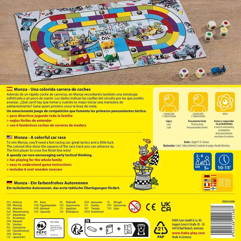 ¡Arrancan los motores! Con MONZA, los niños y niñas vivirán la emoción de una carrera de coches mientras aprenden a pensar estratégicamente, reconocer colores y planificar sus movimientos.