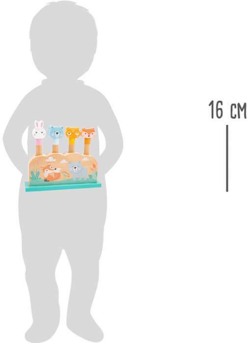 Deja que los peques descubran la magia del salto y del juego libre con este encantador juego de madera con colores pastel. Sobre una base de madera estable, cuatro tiernos animales en tonos suaves se introducen en aperturas que, gracias a pequeños resortes ocultos, los hacen brincar hacia arriba cuando entran. Esta sorpresa de movimiento invita a la exploración, al descubrimiento de causa-efecto y al desarrollo de la motricidad fina.