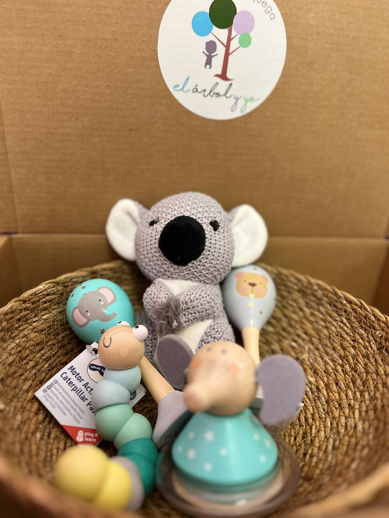 Incluye: Koala de punto suave + tentetieso elefante+ maracas pastel + oruga celeste. NO Incluye cesto.